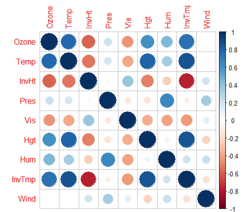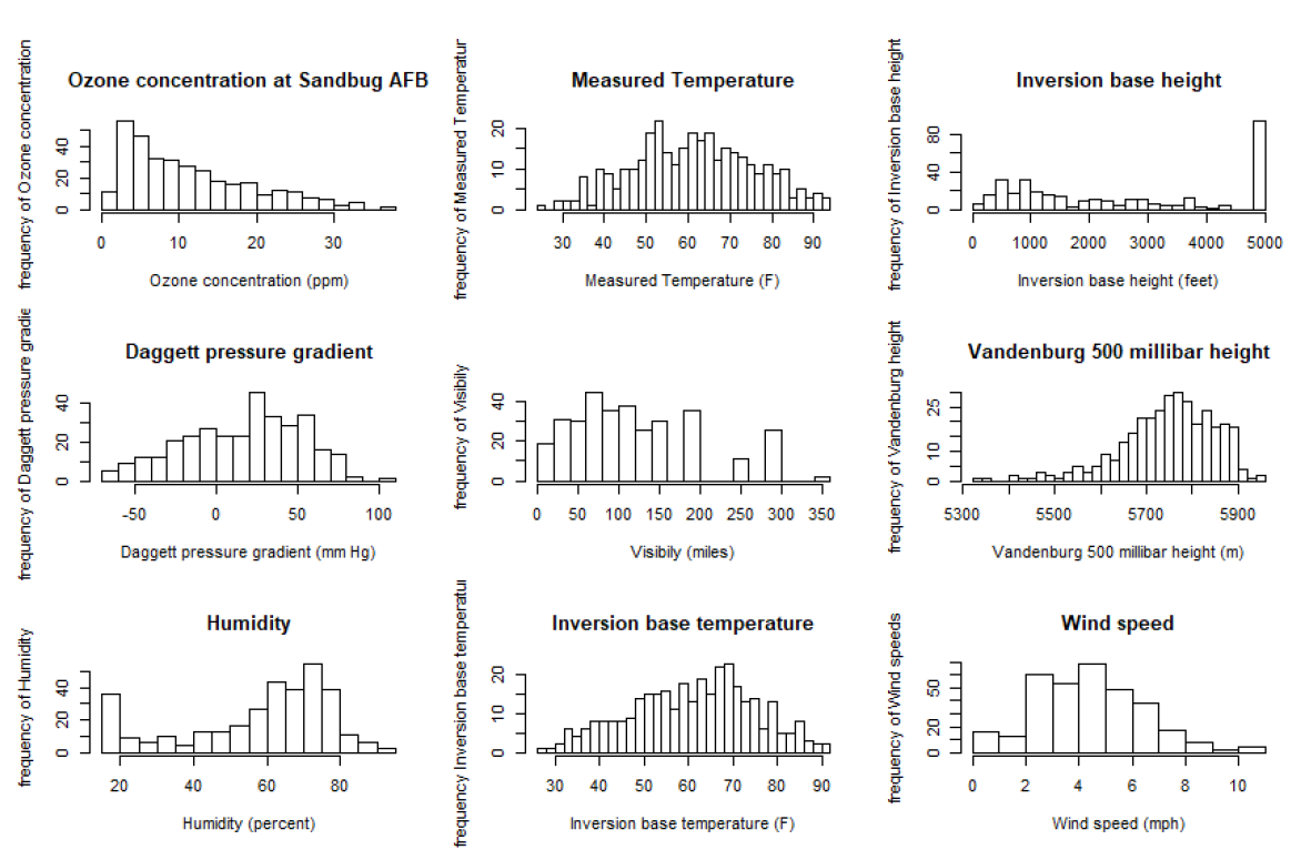 Considerieng sign of the coefficients, we can observe that additive effects without interactions (Temp, InvHt, Pres, Hgt, Hum) have all negative signs. We can see that the „strongest“ coefficient is for humidity, with value 1.091e+00. It would be easy to conclude that the humidity has the strongest effect on the ozone concentration, however particles modelling is very complex system that is very sensitive to disturbances of any kind. We can see that on modelled interactions. The coefficient with the lowest value of -2.037e-09 is for the interaction between Inversion base height, wind, visibility and Inversion base temperature, however it is still significant and we can conclude that even the tiniest increases or decreases in these variables can change the ozone concentration. The effect applies on any other interactions as well. We were surprised that in the final model, the wind speed is not significant. The intuition could deceive us that the ozone particles can be „blown away“ however it does not seems to be so easy. The wind speed seems to interacts with Inversion related variables (Inversion base height and Inversion Temperature, and also with Visibility) with more than 6 times lower values when comparing with Humidity. The weakness of the model also can be that it does not take into consideration directly effect of the air pollution. armful levels of ozone can be produced by the interaction of sunlight with certain chemicals emitted to the environment (e.g., automobile emissions and chemical emissions of industrial plants).