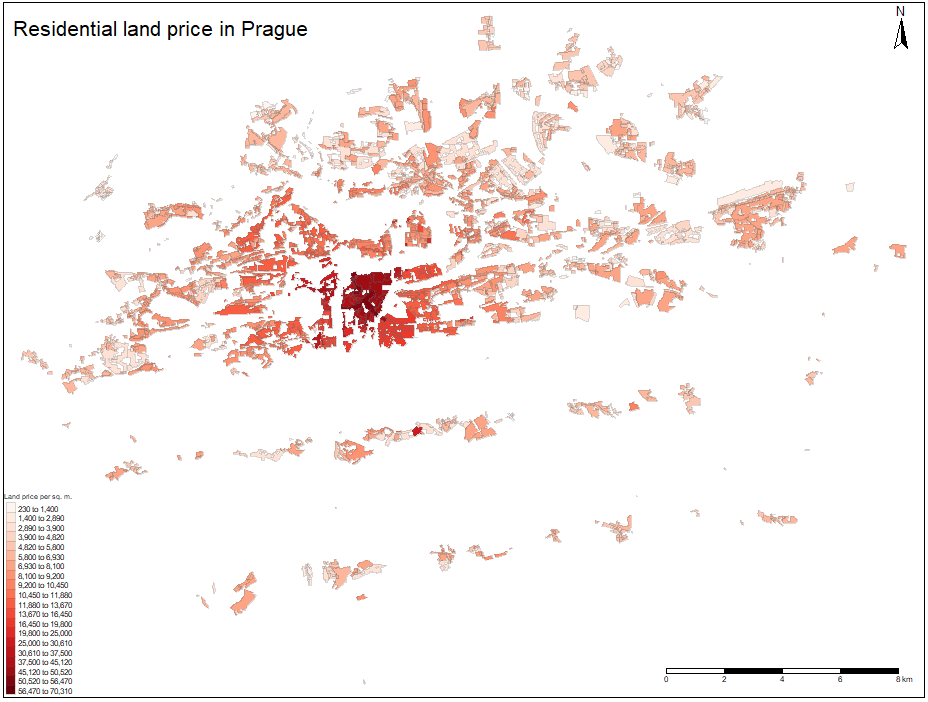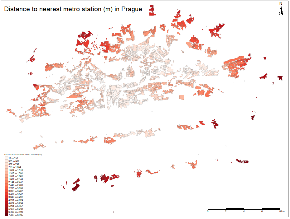 On the figure below, spatial distribution of the nearest metro distances for each polygon is plotted. The lowest values can be seen on the eastern bank of the Vltava river. By visual observations it can be concluded that the distance to nearest metro station is increasing with increasing radius from city center as the lowest values can be observed there. This development makes perfectly sense from the historical point of view as well as the stations were build initially in the center with so called switching triangle (stations Můstek, Muzeum, Florenc). This concept of development was typical in many former Eastern Block cities 1. For better insight, watch the referenced animation 2.