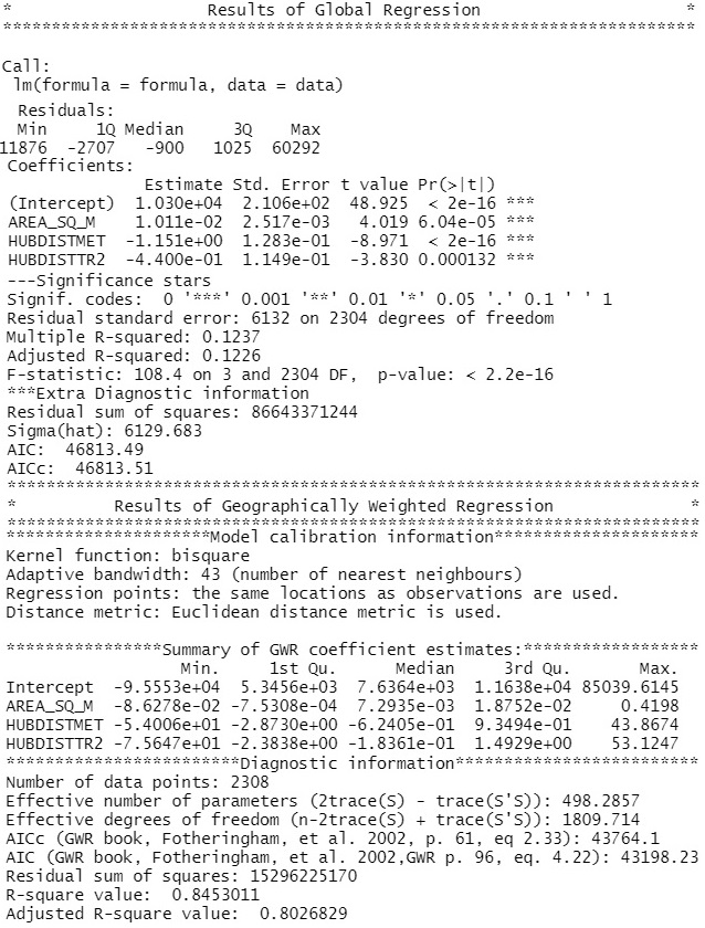 After reprojecting the data to UTM grid, several types of Geographical Weighted Regression models were estimated. After fitting basic GWR model to the data, it has turned out that the suffers from multicolinearity of the independent variables. The coefficeints for distances in the full GWR model did not have plausible signs. It was expected for the coefficients to be negative which would imply that with increasing distance to nearest public transport terminal price of the land decreases. However, in some cases, these coefficients had positive sign, resulting in non realistic behaviour, compared with empirical findings. As the independent variables are highly correlated, Geographically Weighted Ridge and Geographically Weighted Lasso regression models were fitted, as in these models, the assumption of non-correlated independent variables is relaxed. Although these models provided improvement, some coefficients did not have plausible sign anyway. Therefore, reduction of the model was performed. The selection of the best performing model was based on the highest R^2 and the lowest AIC criterion. Several combination of the independent variables and kernel functions were investigated. Removing the nearest train and the nearest bus stop distance independent variables provided the best fit, in terms of the above mentioned criteria. The summary table of the model’s output from R is printed below.