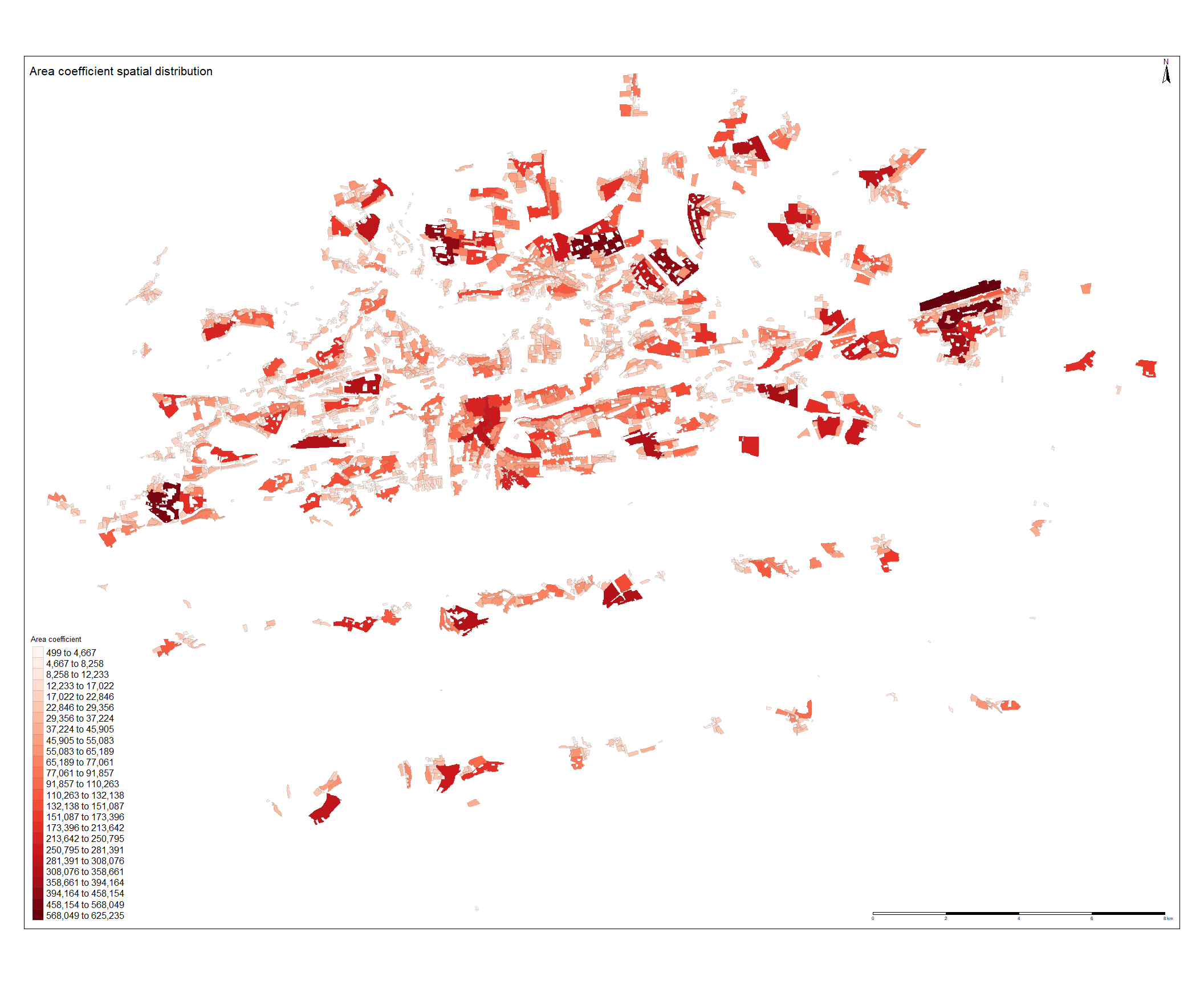 On the figure below, spatial distribution of the area coefficient estimate is ploted. The values seems to have plausible sign, indicating an increasing effect of the residential land price. Unlike for