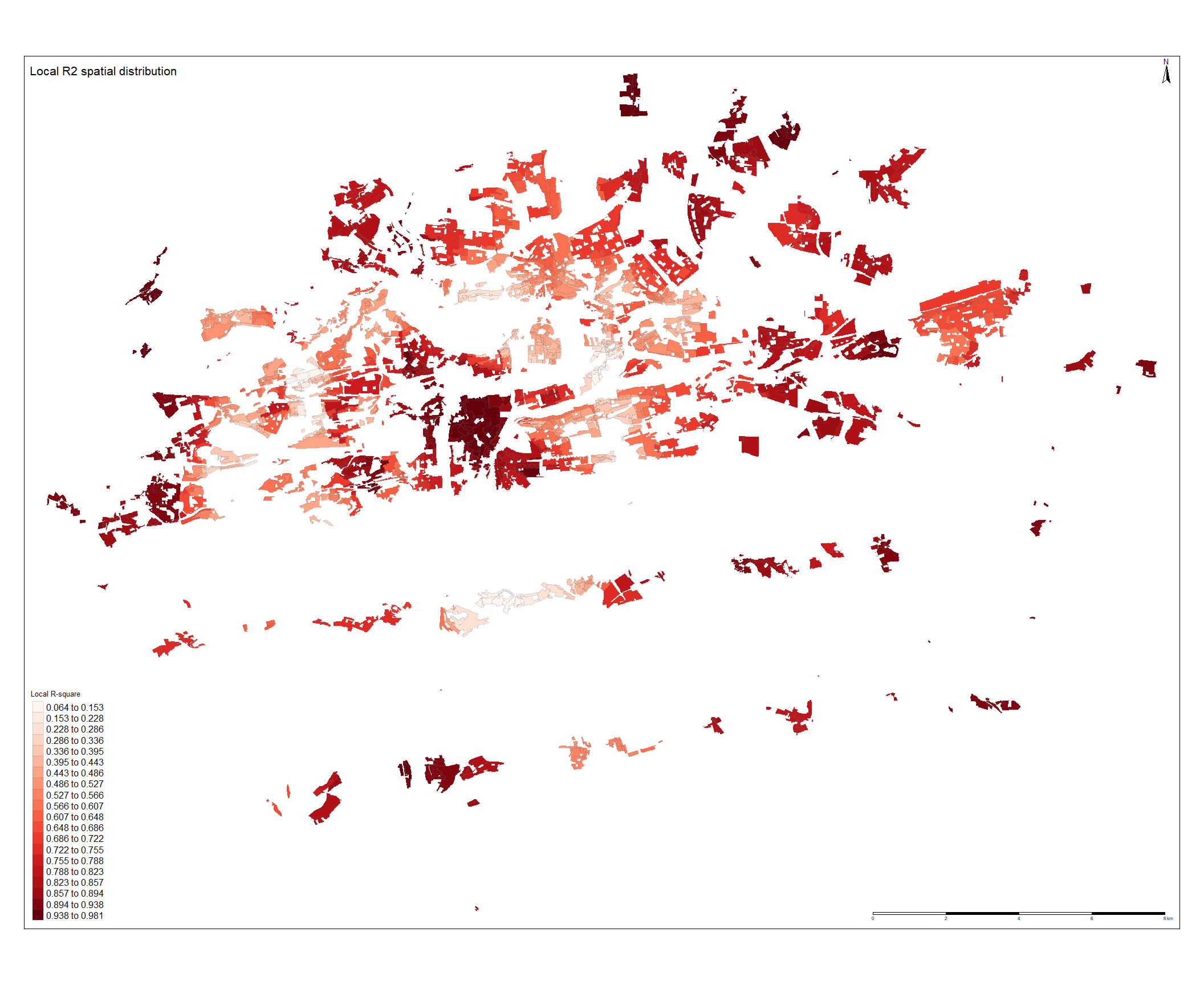 used are independent. As it was already explored in the previous chapter, this assumption is violated as there are significant spatial clustering patterns in the data. In Geographically Weighted Regression, this assumption is relaxed, as it allows for spatially varying coefficients by producing estimates