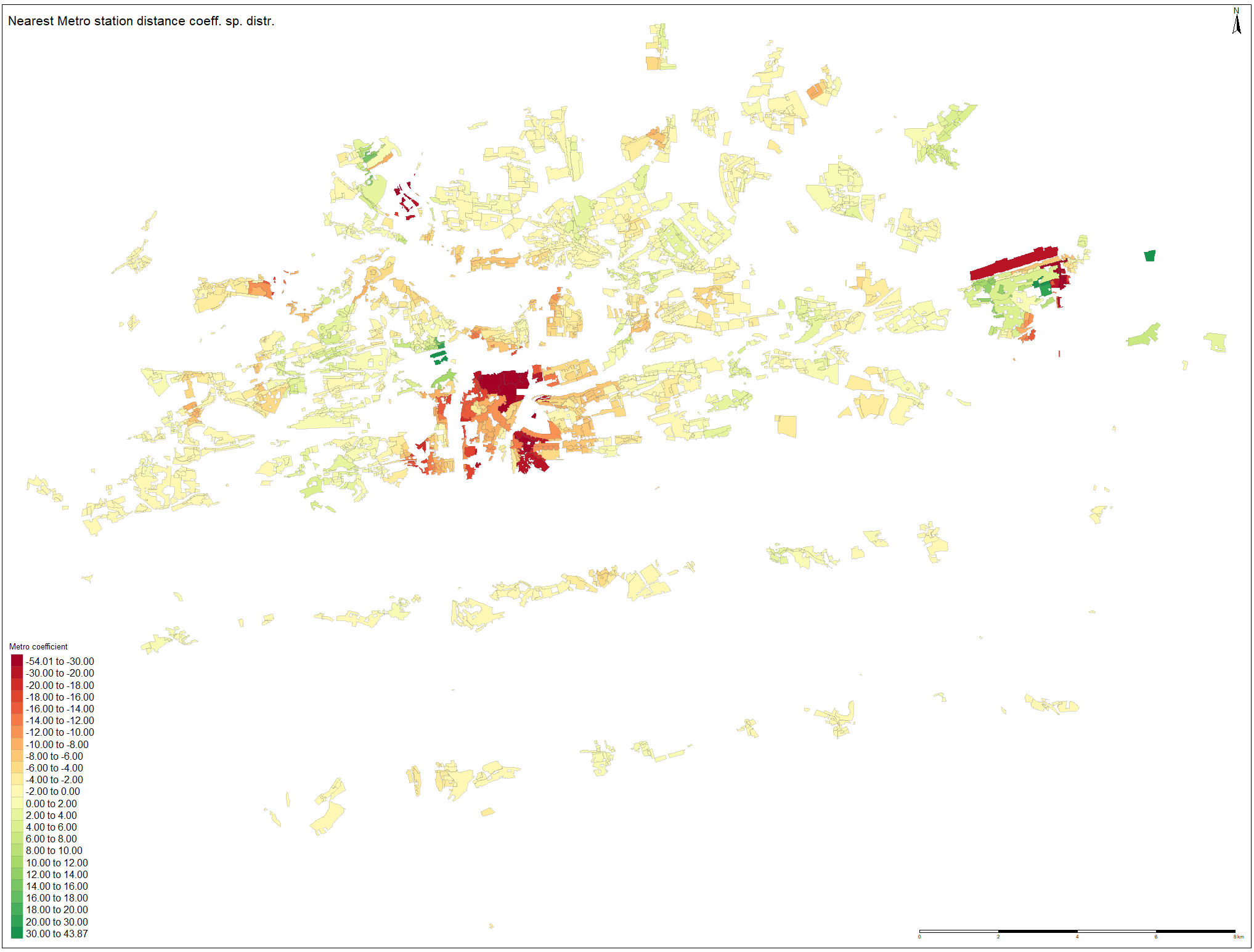 The Geographically weighted regression is a powerful tool to quantify how much the distance to nearest public transport terminal affects the residential land price. Although some limitations have appeared such as unplausible coefficients signs in some areas, in global average, the model presents plausible and realistic results.