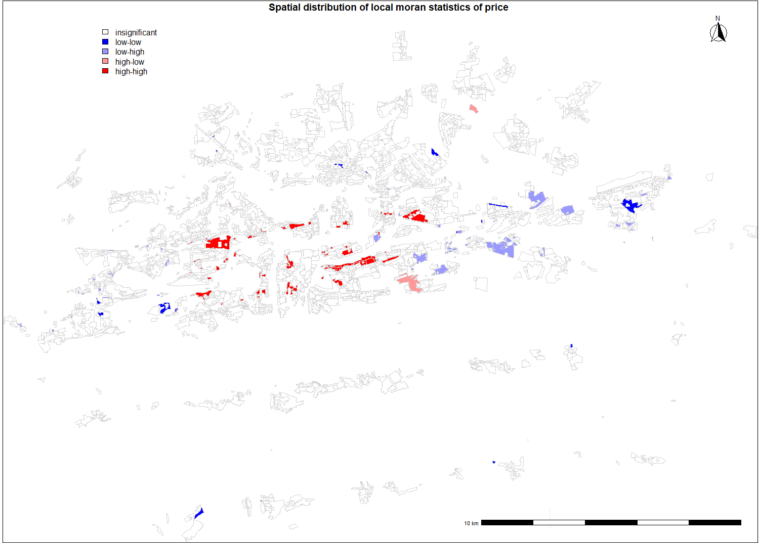 When investigating spatial distribution of local moran statistic of price, we can observe several high value polygons neighbouring with another high value polygons. The most apparent is red area north west. This neighborhood is called Hanspaulka and it consists of historical mansions. Smaller red polygons nearby consists of historical villas as well and they offer beautiful view on the Prague Castle which is nearby. The mentioned factors explain that these areas follow similar spatial clustering pattern. East of the Vltava river meander another large red polygon can be observed. This neighbourhood is called Harfa and it contains newly built luxury penthouses. Generally it can be concluded that high area regions neighbouring with another high area regions consist of either historical mansions, luxury penthouses or historical apartment blocks. Large blue polygons on the eastern part of the city contains mostly separated concrete panel apartment blocks, that were built during communist era. Although the outlying blue polygon on the south end of the city consist of detached houses, its located near highway and ring road crossing and no metro station is nearby, these factors contributes to result of low value of moran statistics.