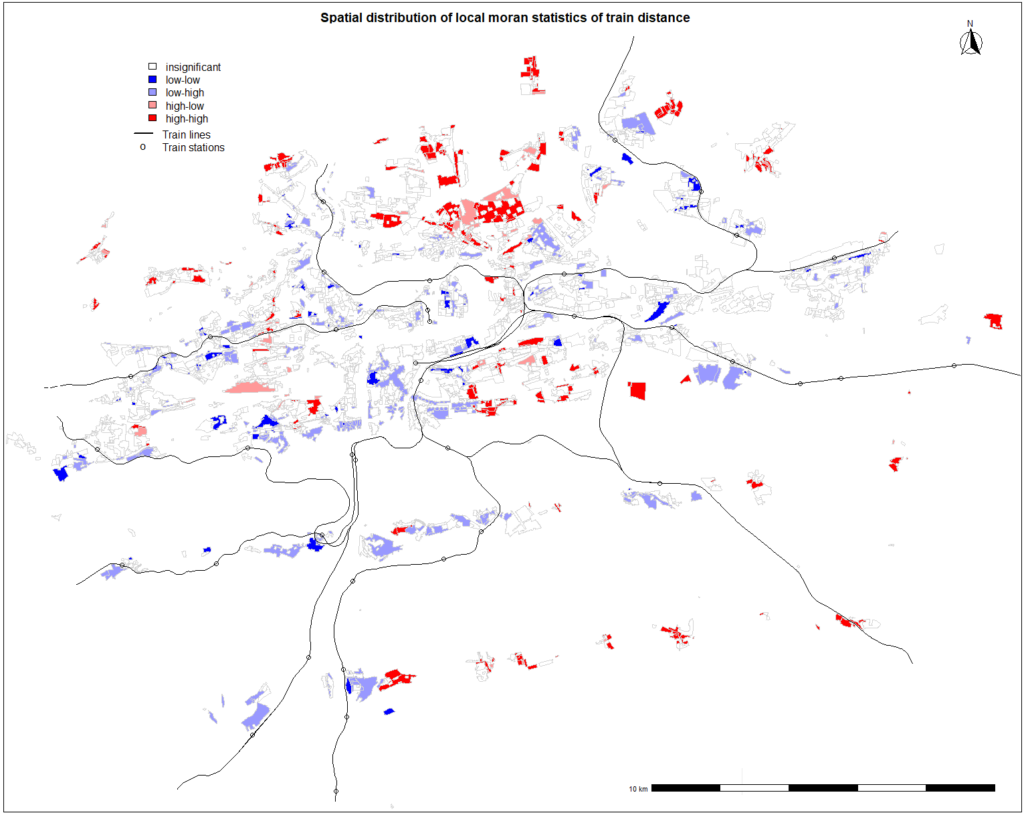 Spatial distribution of local Moran statistics for nearest train station distance is illustrated. It can be seen that the train network in Prague is shaped into a star with the main terminal (Praha Hlavní nádraží) in the city center. This corresponds with the original purpose of the system as it was designed to be used as a commuter rail for the suburban regions. There are 10 sections of the train lines that leads to Central Bohemian Region and the majority of low distance regions are aligned around them. Red polygons can be seen in the geographical center of the map however this cluster is completely surrounded by rail lines and it is well connected to other modes. North of the city center, large cluster of red polygons can be observed near Bohnice Municipality. It seems that this clustering pattern is repeating as some of these clustered areas has turned out red for buses and metro distances as well, implying poor connectivity which apparently leads to lower residential land prices in this region, concluding similar results with the findings in empirical analysis.