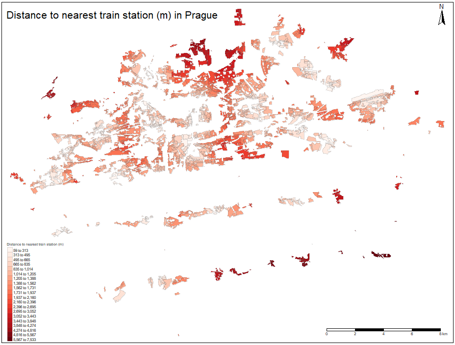 The spatial distribution of the nearest train station distances for each polygon is depicted on the figure below. When inspecting the picture, it seems that the values are scattered as no low distances cluster of polygons is apparent and any other spatial pattern is not clear on the first look. When comparing with tram and metro spatial distribution of distances, we can observe that the areas on the eastern end of the city, near the border with Central Bohemian Region is better connected to the train network, rather than any other mode of public transport. This corresponds with the fact, that this part of the city has suburban character and it was designed for its residents to commute by rail.